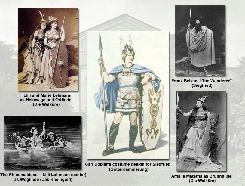 | The first production of Der Ring des Nibelungen took place on August 13, 14, 16, and 17, 1876 at the newly-built Festspielhaus at Bayreuth. The composer supervised the entire production. Hans Richter was the work's first conductor, assisted by Felix Mottl and Anton Seidl, who years later conducted the Metropolitan Opera premiere of this work. Wagner commissioned Viennese landscape artist Josef Hoffmann to design sketches for the production. These were later turned over to Gotthold and Max Brückner, stage designers of the opera at Coburg, so that they could be turned into stage scenery. The costumes for this production were designed by Carl Döppler. The Teutonic creations that this team came up with would influence Wagnerian productions up until the mid twentieth century. |